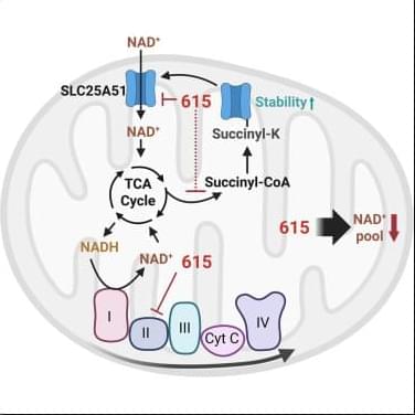 Online now: Jia et al. reveal that KRAS-mutant leukemic cells, which express low SLC25A51 protein, are selectively killed by 615 through reducing mitochondrial NAD+. 615 simultaneously binds to and inhibits both SLC25A51, a mitochondrial NAD+ importer, and SDHA, an ETC component. It further reduces SLC25A51 protein by decreasing K264 succinylation, thereby depleting mitochondrial NAD+.