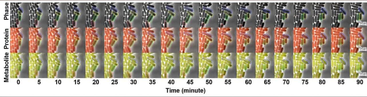 The work, published in Nature Communications, tracks hundreds of E. coli cells as they produce a yellow food pigment—betaxanthin—while growing, dividing and carrying out normal metabolic activities.
